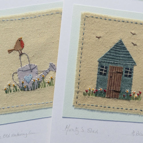 Each hand-stitched miniature is mounted onto a card made from 100% recycled card measuring 12 x 9cm (3.5” x 5”) when folded as shown and comes with recycled paper envelope in a clear compostable cornstarch sleeve, no plastic. The cards carry a title and each is signed on the front, with my studio stamp on the back, blank inside.